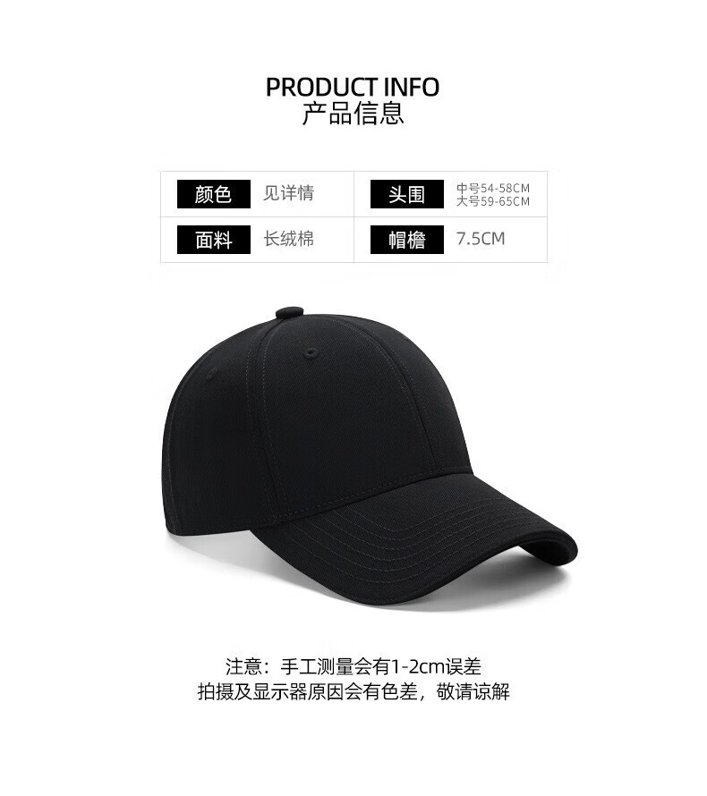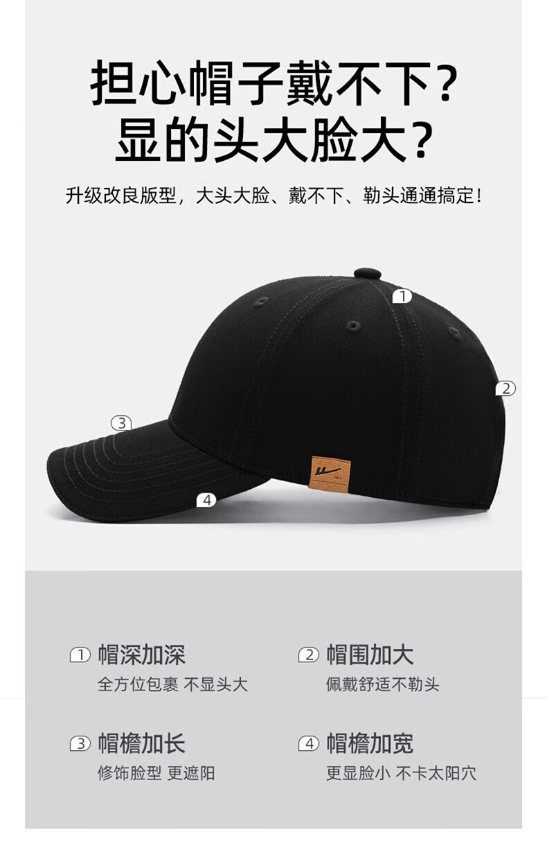 国潮红旗大头围帽子男士运动潮流棒球帽男情侣显脸小鸭舌帽帽子女 黑色中国 高品质 卡扣可调节53-65cm